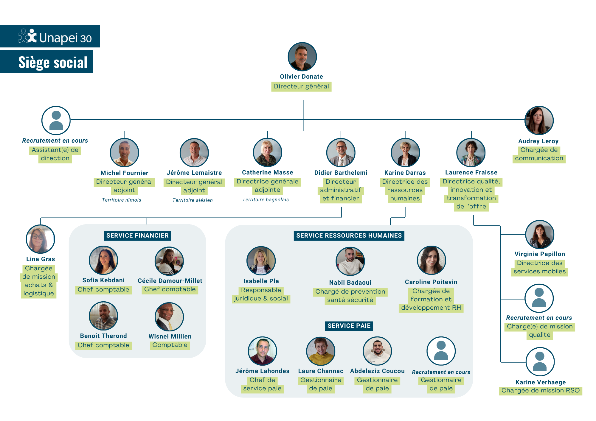 Afin de mettre en œuvre sa politique associative dans les établissements, l’Unapei 30 a mis en place une direction générale, dont les services sont regroupés au sein d’un siège social agréé.